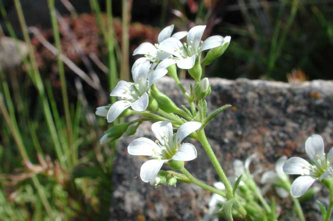 Les flors, de color blanc, s'agrupen a l'extrem de tiges quasi sense fulles.